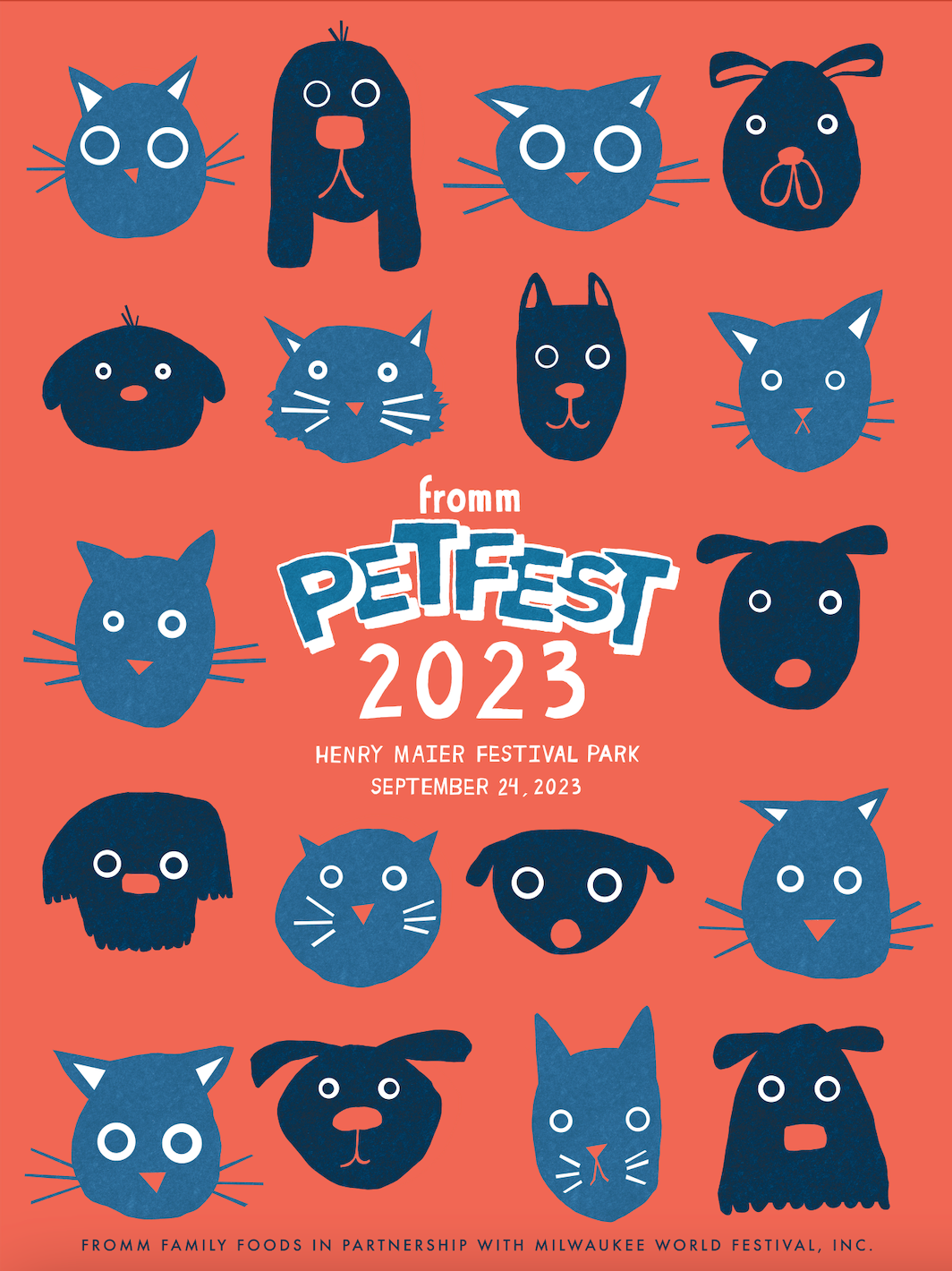 Created at the Milwaukee Institute of Art and Design, this poster was designed for the 10th annual Fromm Petfest held at Henry Maier Festival Park in Milwaukee. The concept draws on the festival’s celebration of pets and community, featuring a playful grid of stylized dog and cat faces. The repetition and variety of expressions reflect the diversity of pets while creating a bold, graphic composition that stands out in print and digital promotion.