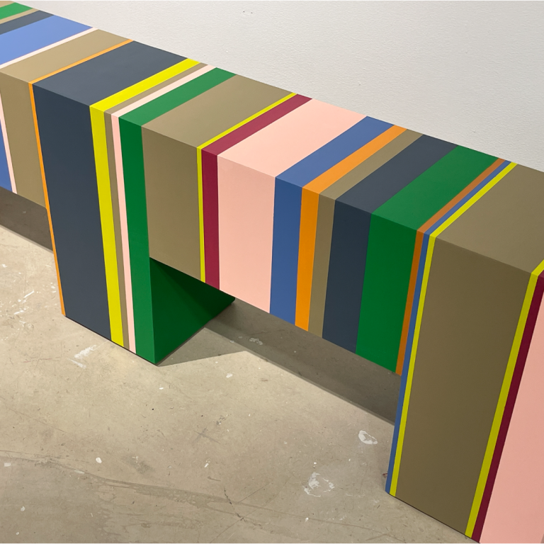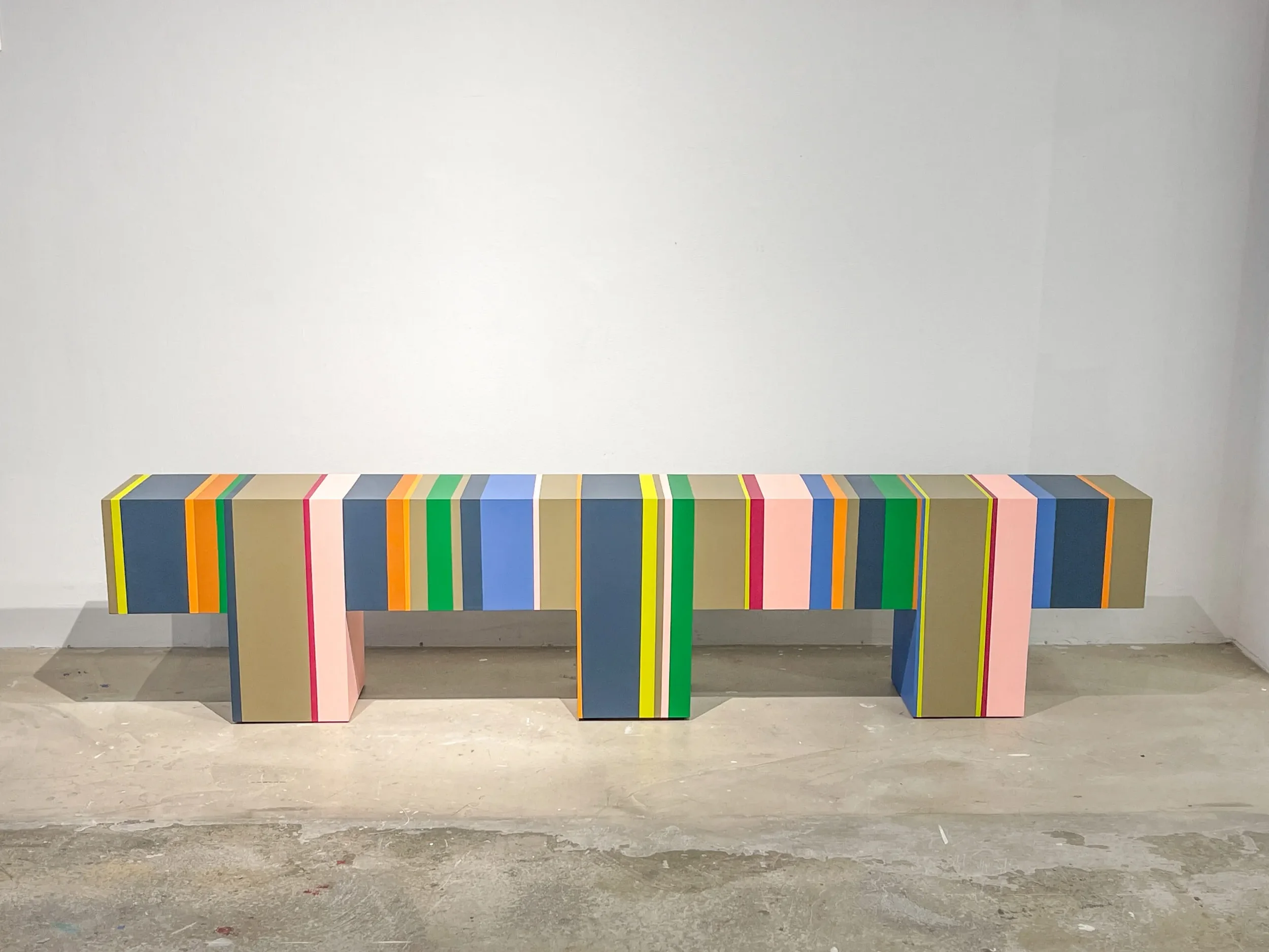 Finishing: Once built, the surface was carefully sanded and hand-painted with a bold stripe pattern. The palette and arrangement were intentionally eclectic, creating a visual rhythm that feels both chaotic and harmonious.