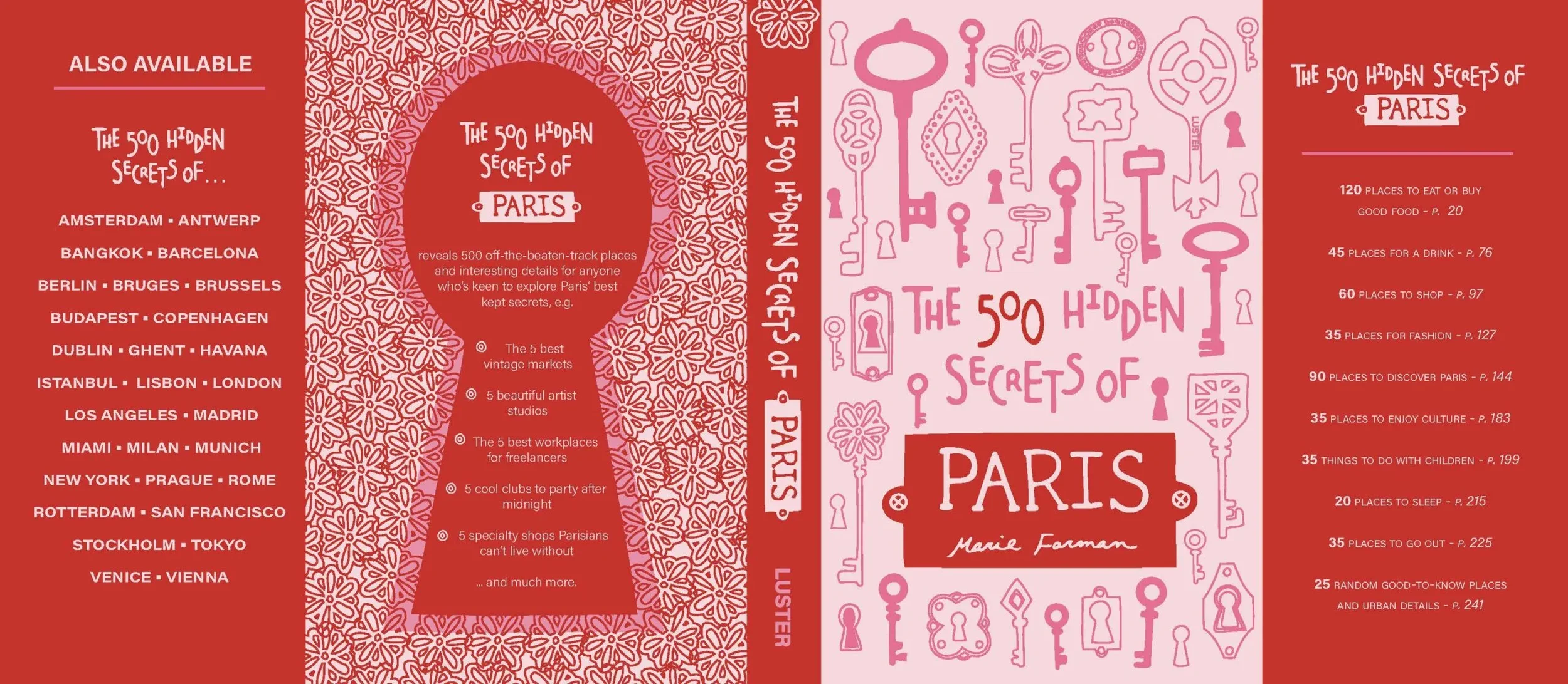 This student project reimagined the cover of The 500 Hidden Secrets of Paris by Marie Farman. The redesign plays on the theme of “secrets” by incorporating a collection of hand-illustrated keys and keyholes, referencing both the idea of unlocking hidden places and the charm of Parisian detail. A pink and red palette was chosen to create a fresh, eye-catching aesthetic that feels playful yet sophisticated.